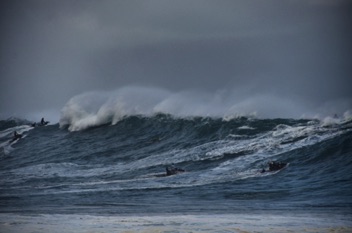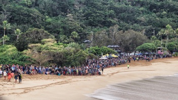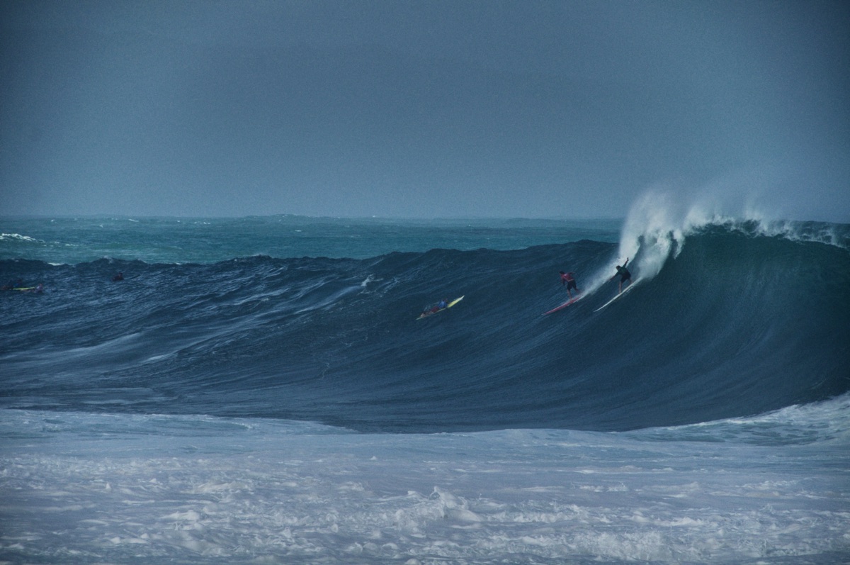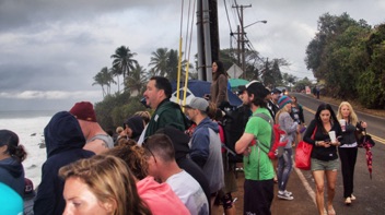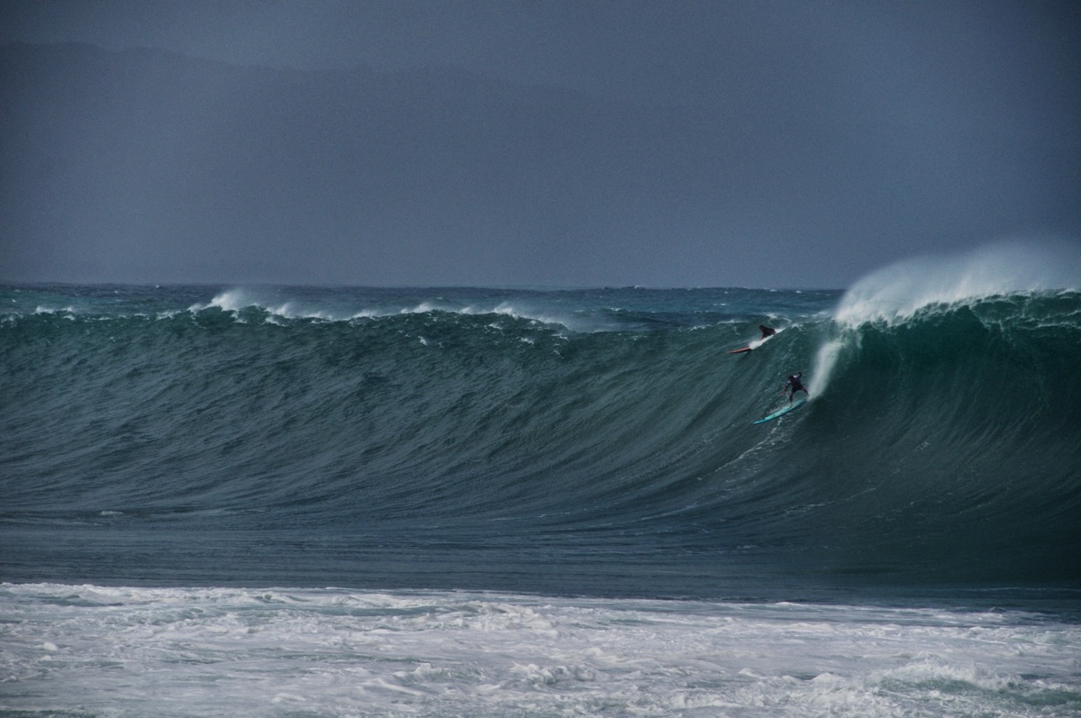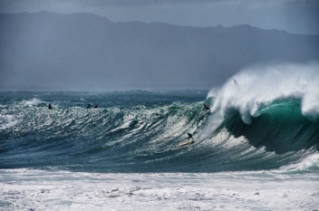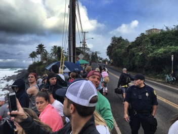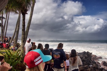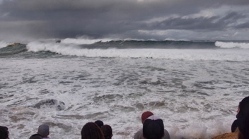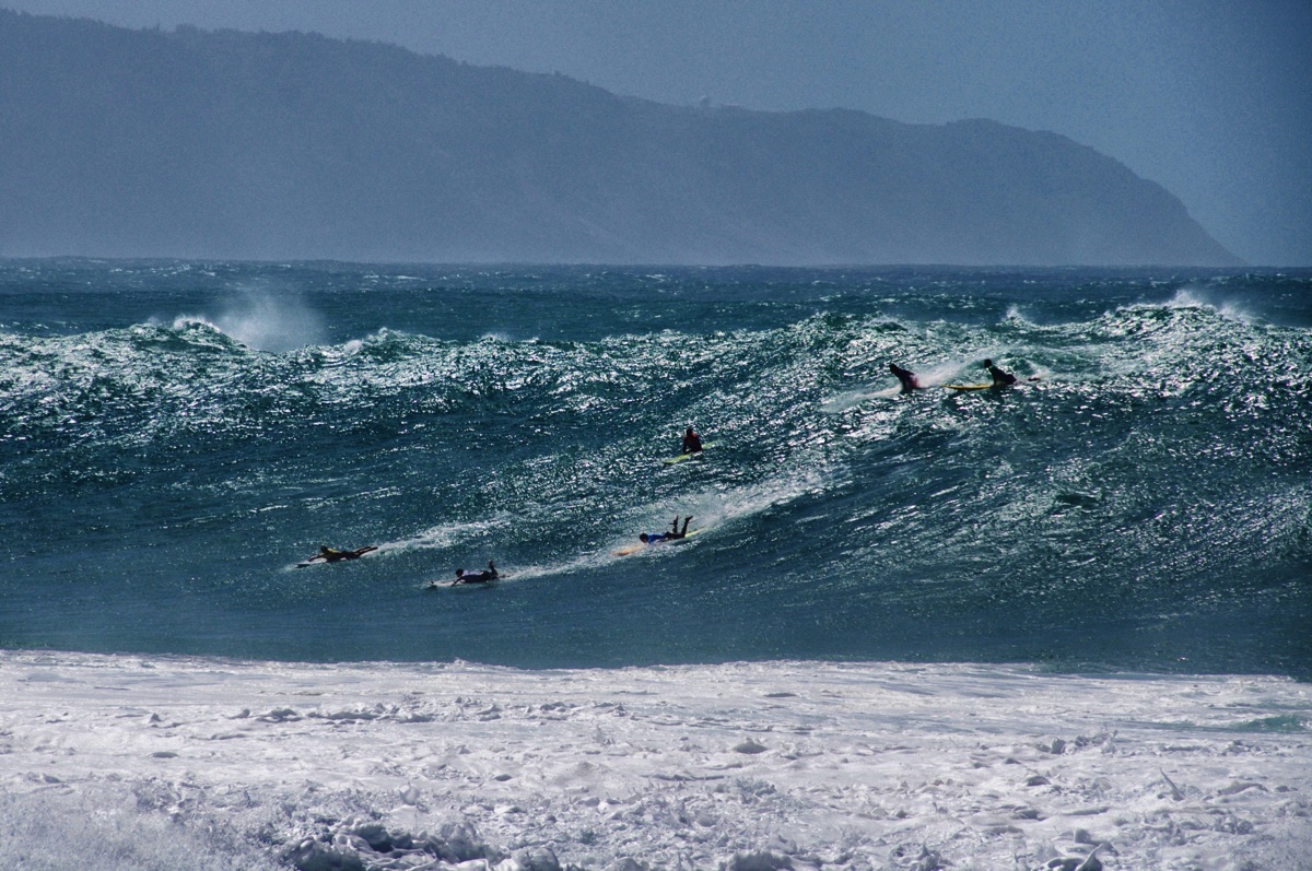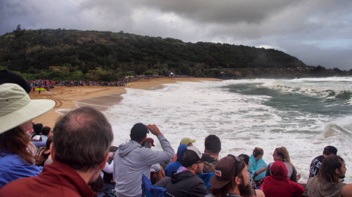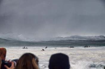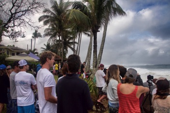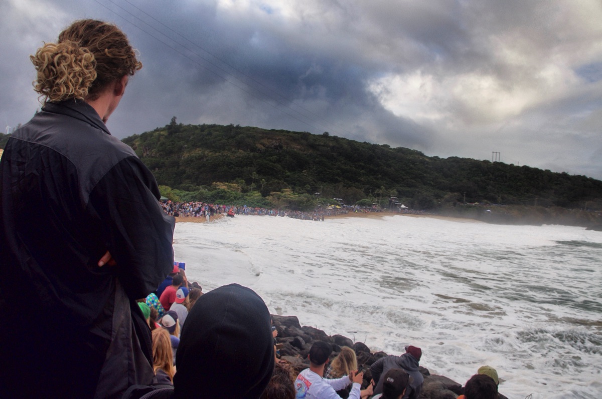 I left Laie at 7am and drove to and parked Big Red, my truck at Sunset Beach. I rode, Little Red, my bike the remaining 2 miles to Waimea. Hardly any traffic on the road. Why? There was no where to go. The sides of the streets were packed with cars. You would have been insane to keep driving. So I rode my bike right down the middle of Kam Hwy. I saw signs that said $50 Parking. The grass lot was packed. I finally made it right below the church at the first vantage point of the bay. A mob completely lined the natural amphitheater that we call Waimea Bay. The bay was buzzing, the energy, the tension was tight. Jet skis dodging the inside thunder walls as the first heat hit the water. I was stuck on the side of the road with my bike wondering where I could go. All the views were taken so I stood there leaning on my bike while more and more people walked around me and down the road. Lucky I had the height. I snapped the first 12 or so photos to capture the crowd. It was still a little dark because of the early morning cloudy skies.