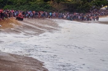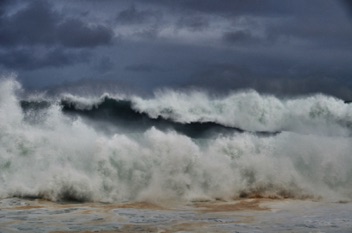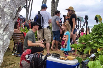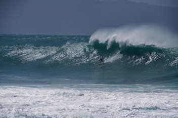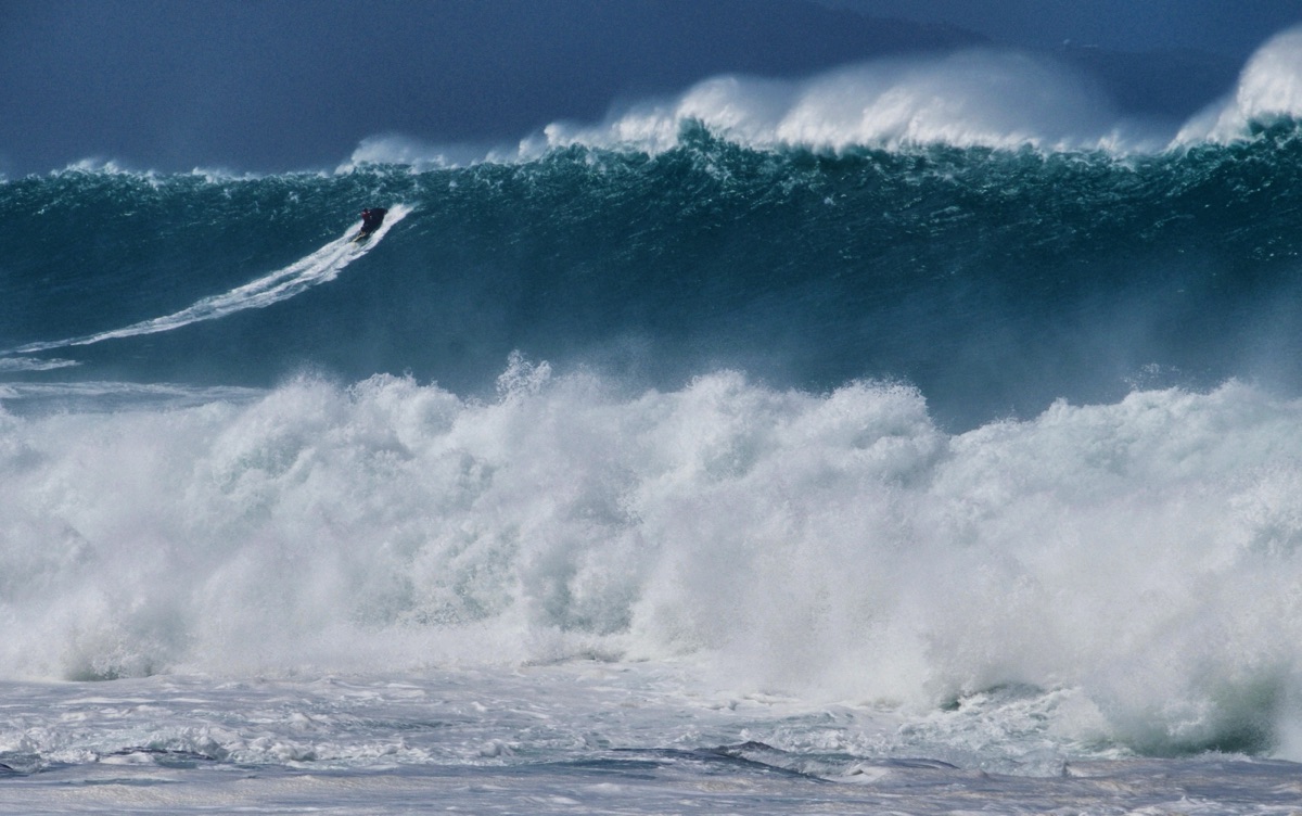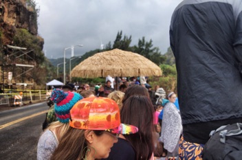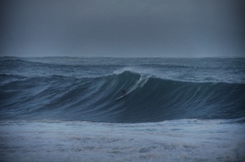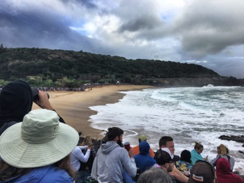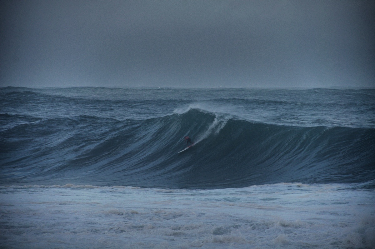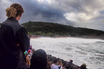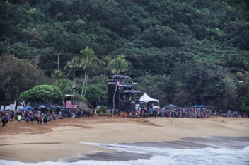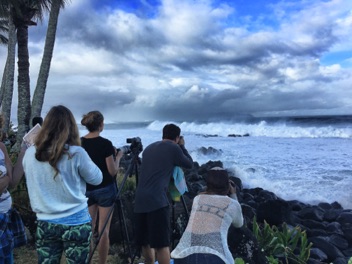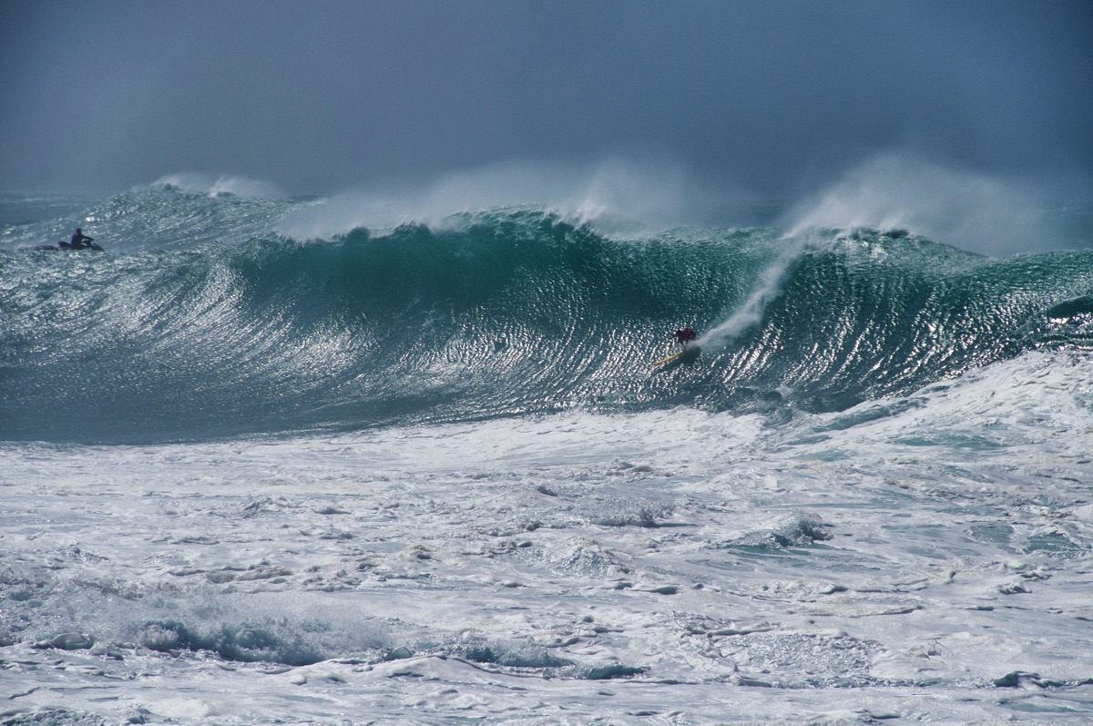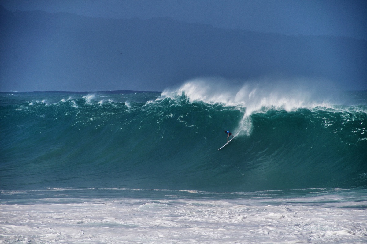 I left Laie at 7am and drove to and parked Big Red, my truck at Sunset Beach. I rode, Little Red, my bike the remaining 2 miles to Waimea. Hardly any traffic on the road. Why? There was no where to go. The sides of the streets were packed with cars. You would have been insane to keep driving. So I rode my bike right down the middle of Kam Hwy. I saw signs that said $50 Parking. The grass lot was packed. I finally made it right below the church at the first vantage point of the bay. A mob completely lined the natural amphitheater that we call Waimea Bay. The bay was buzzing, the energy, the tension was tight. Jet skis dodging the inside thunder walls as the first heat hit the water. I was stuck on the side of the road with my bike wondering where I could go. All the views were taken so I stood there leaning on my bike while more and more people walked around me and down the road. Lucky I had the height. I snapped the first 12 or so photos to capture the crowd. It was still a little dark because of the early morning cloudy skies.