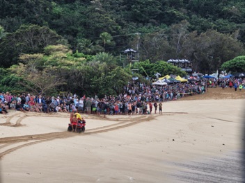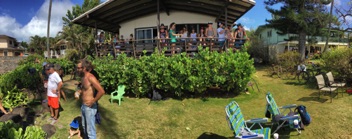 I suddenly saw a familiar face in the crowd. Brady Yee, our hanai son, refrigerator raider, good friend to our kids, Kainui neighbor small kid time. " Wassup?" I said. He replied "Hey, come hang with us, we're stayhing at a beach house on the point with a great up close view of the take off spot." Shoots", I said and we walked back up to the point and carried my bike into the back yard. So there was Brady, wife Aulbry, kids and 40 other people all hanging like it was some north shore surf meet. Yeah baby, it was the EDDIE!!