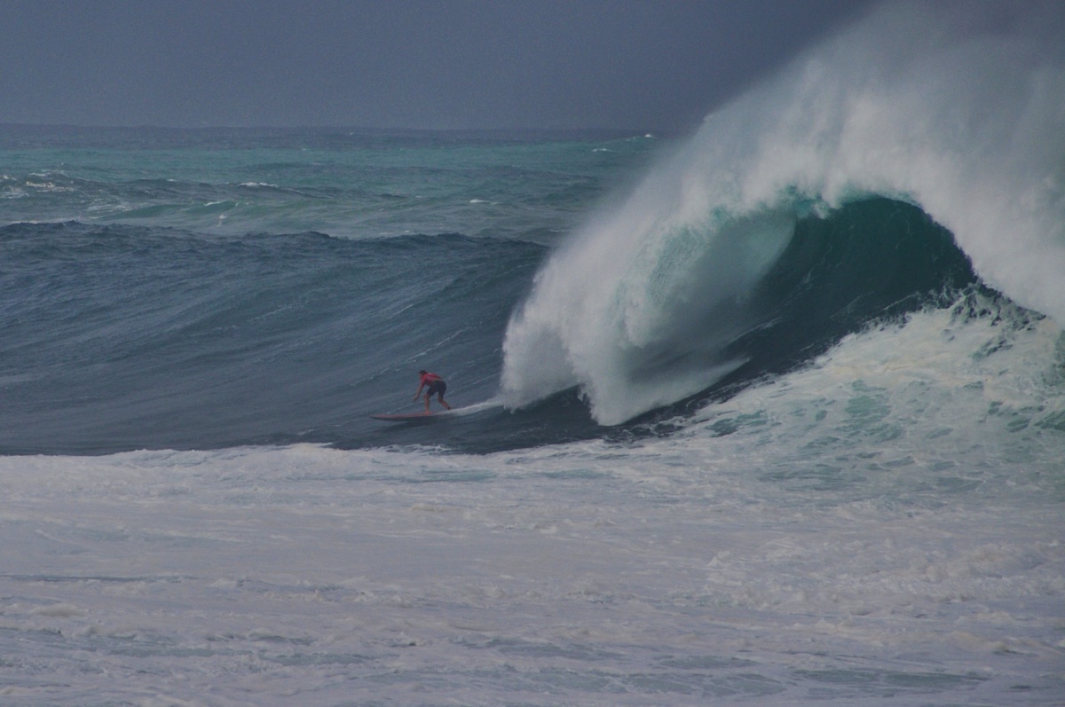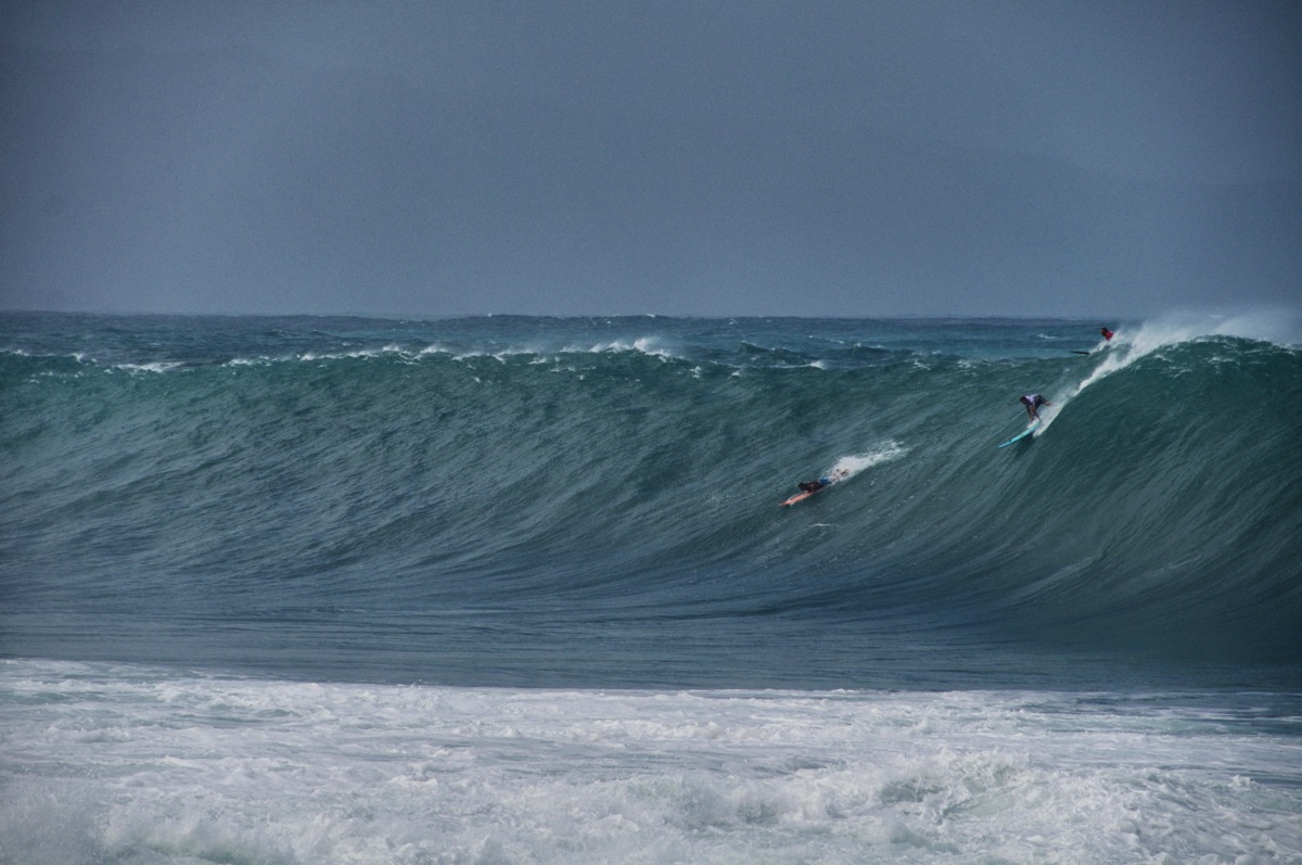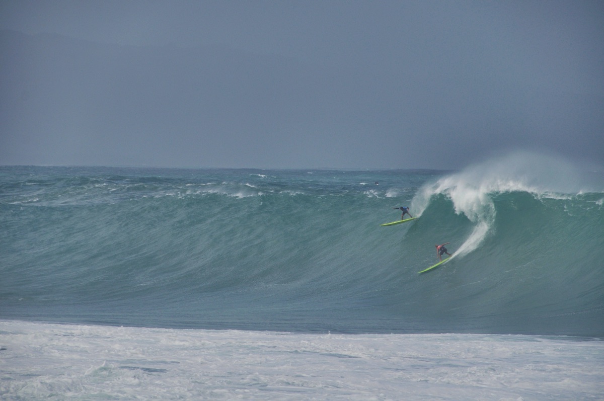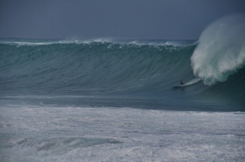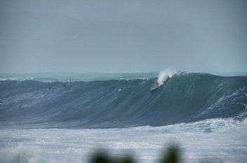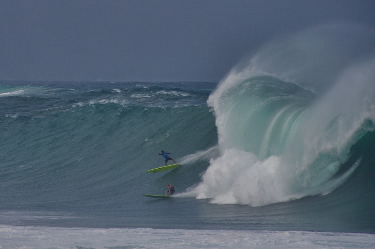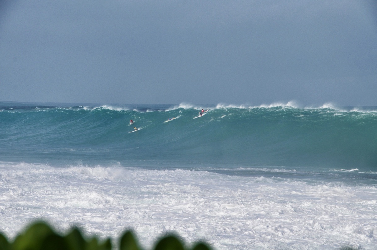 The deck was crowded so I grabbed me a coconut tree to protect me from the sun and found myself at the ocean's edge with a spectacular view of the line up. For 8 hours I screamed and yelled along with everybody else when anybody caught a wave or a monster set would come it. It was chicken skin folks. In my 64 years, I've never witness anything like it. The photos don't do it justice. Finally the sun came out and I got better shots. I don't have a surf lens so I didn't get close ups but I did capture the essence of the day. I put the camera away for so many of the waves. I just wanted to spock the monstors that were rolling in. I had my PBJ and Banana sandwiches, power bars, camel back and my Laie binoculars. I was set for 8 hours of the greatest big wave riding I'd ever witnessed. Here is my collection of memories from the day. There are two pages
